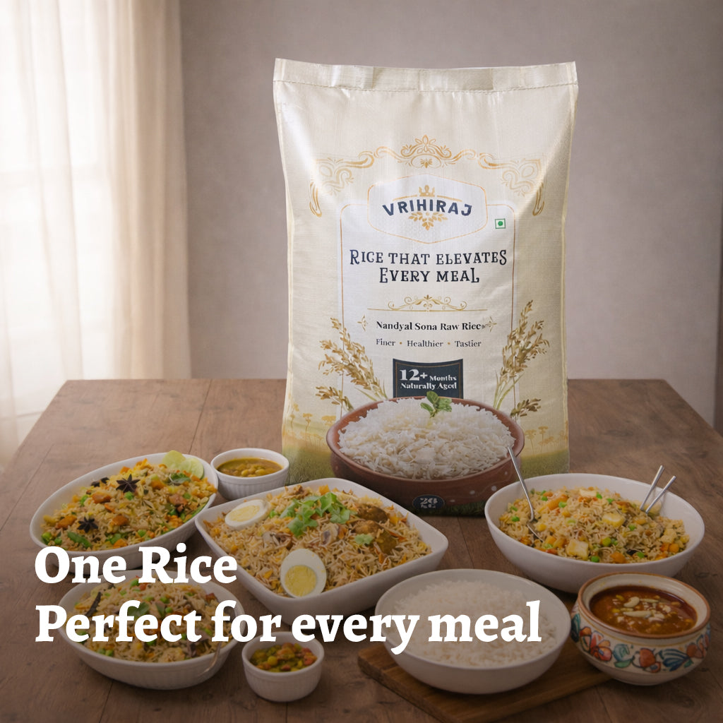 Experience the difference of naturally aged Nandyal Sona rice. From the moment it cooks, the aroma is fuller, the texture lighter, and every grain feels distinct on the plate. Carefully aged and traditionally milled, Vrihiraj rice delivers consistency you can see, smell, and taste