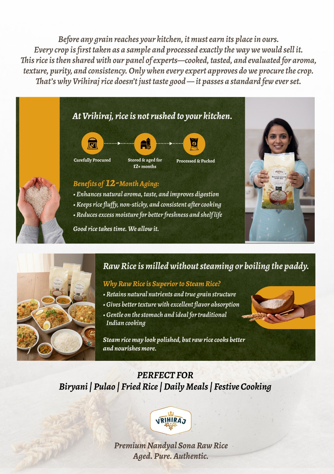 Every batch of Vrihiraj rice goes through a strict expert-led evaluation before it reaches your hands. Our panel cooks, tastes, and inspects each sample for aroma, texture, purity, and consistency, accepting only the lots that meet our exact standards. This careful selection ensures that every pack delivers the same natural fragrance, clean grains, and dependable fluffiness you expect in your daily cooking. With Vrihiraj, quality isn’t assumed