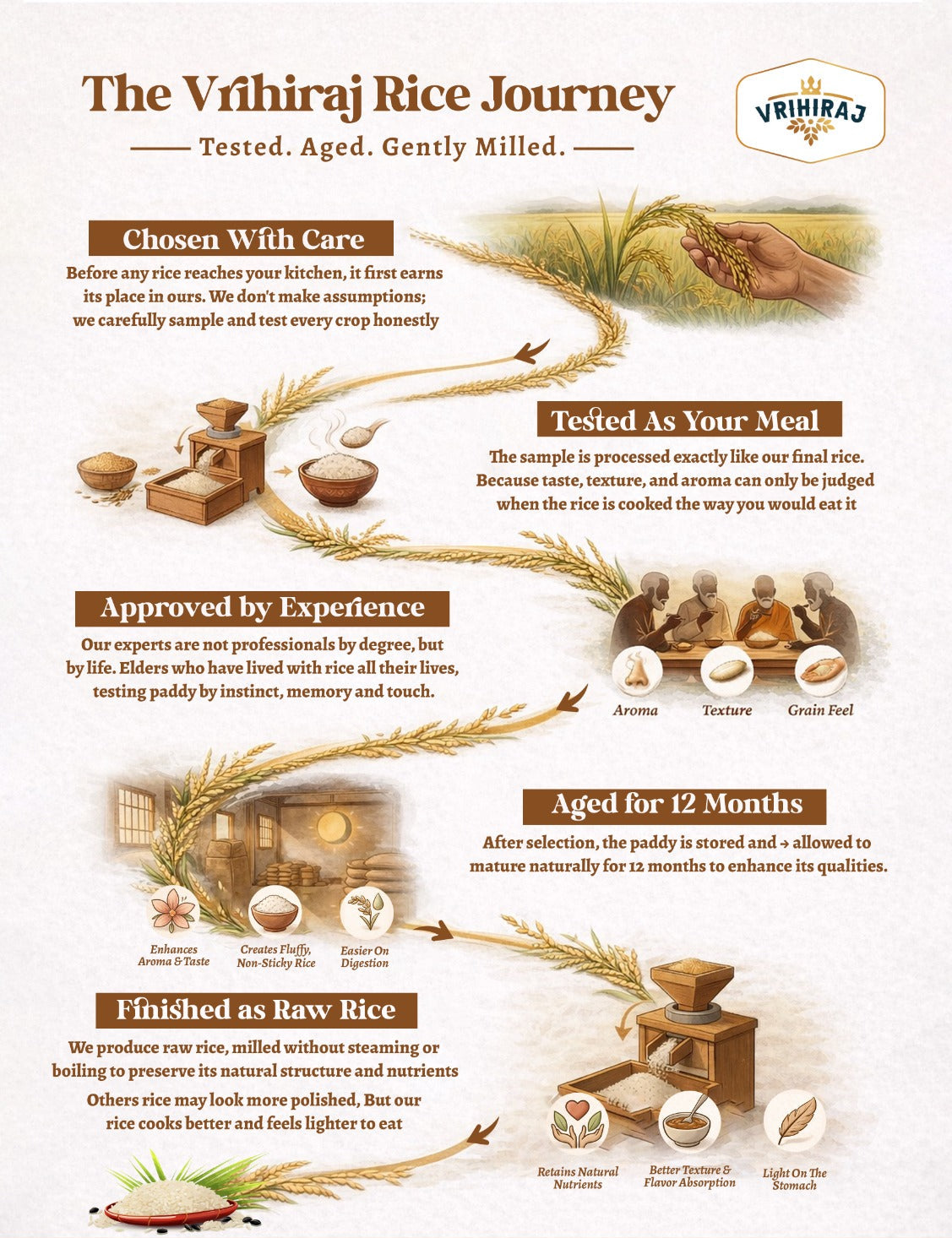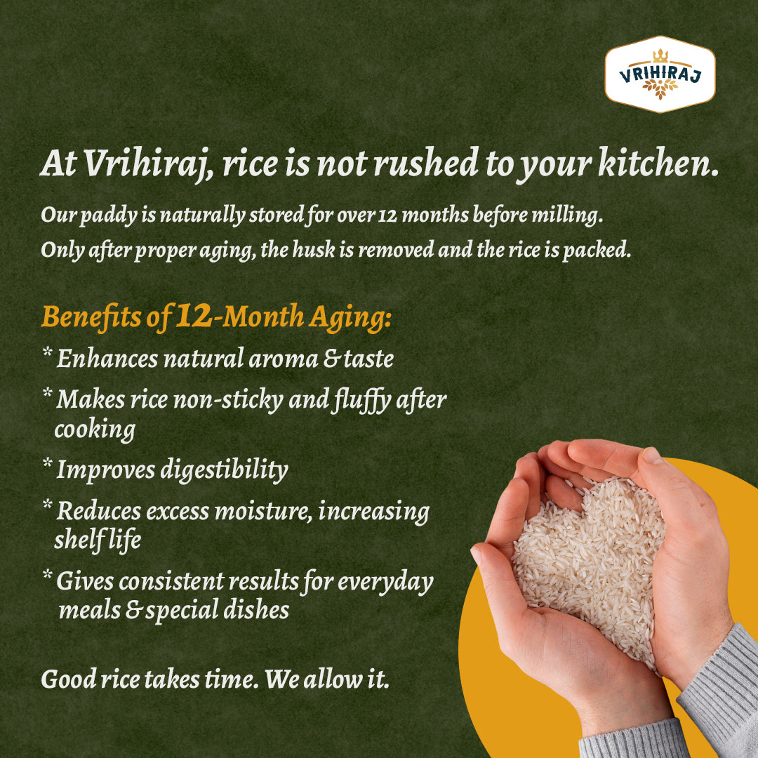 At Vr̥hiraj, rice is never rushed. Our paddy is naturally aged for over 12 months before milling, allowing each grain to develop its full aroma, texture, and taste. Only after proper aging is the husk removed, ensuring every batch meets the highest quality standards.