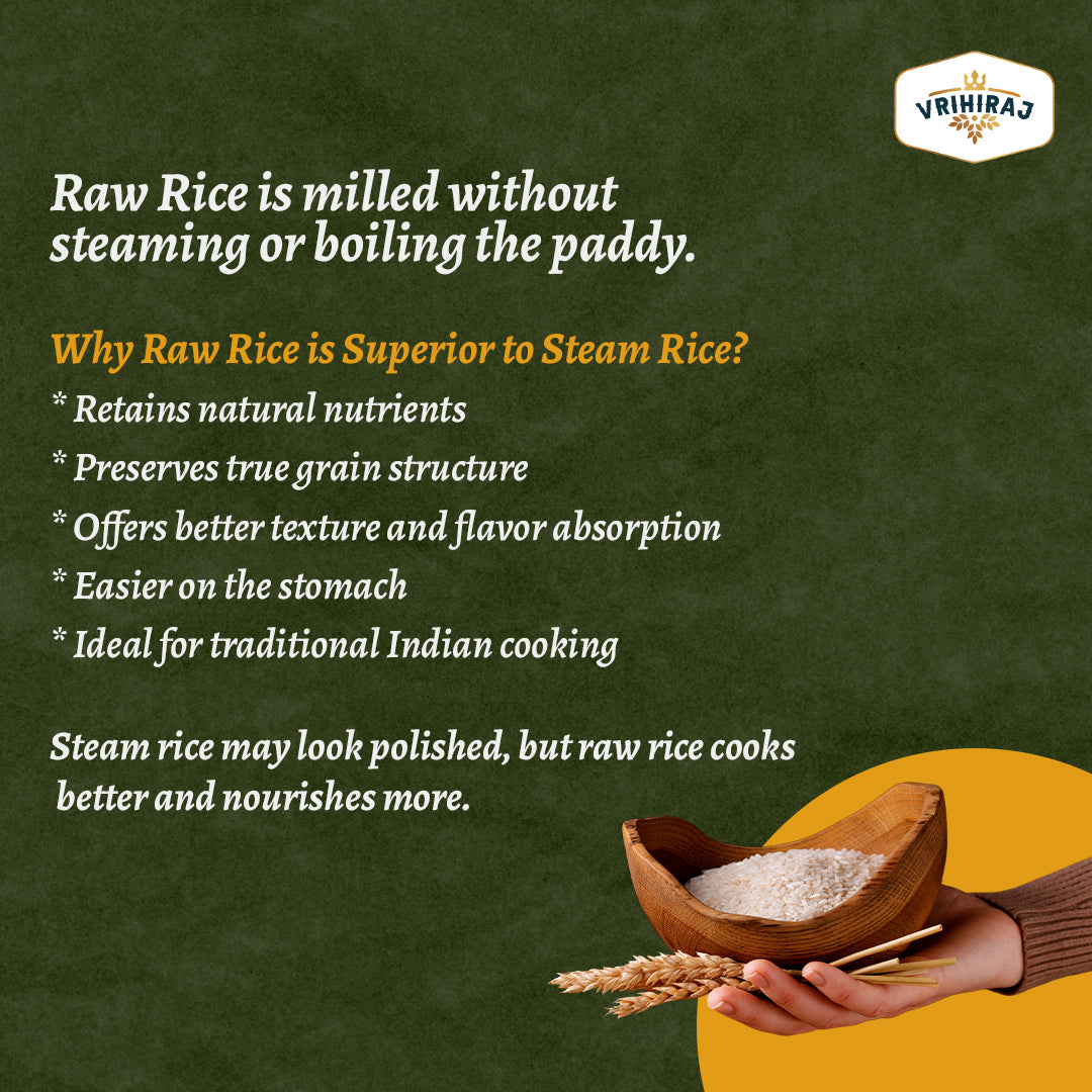 Vr̥hiraj Raw Rice is milled without steaming or parboiling, preserving the grain’s natural nutrients and original structure. This traditional method delivers superior taste, texture, and nutrition compared to steam-processed rice.