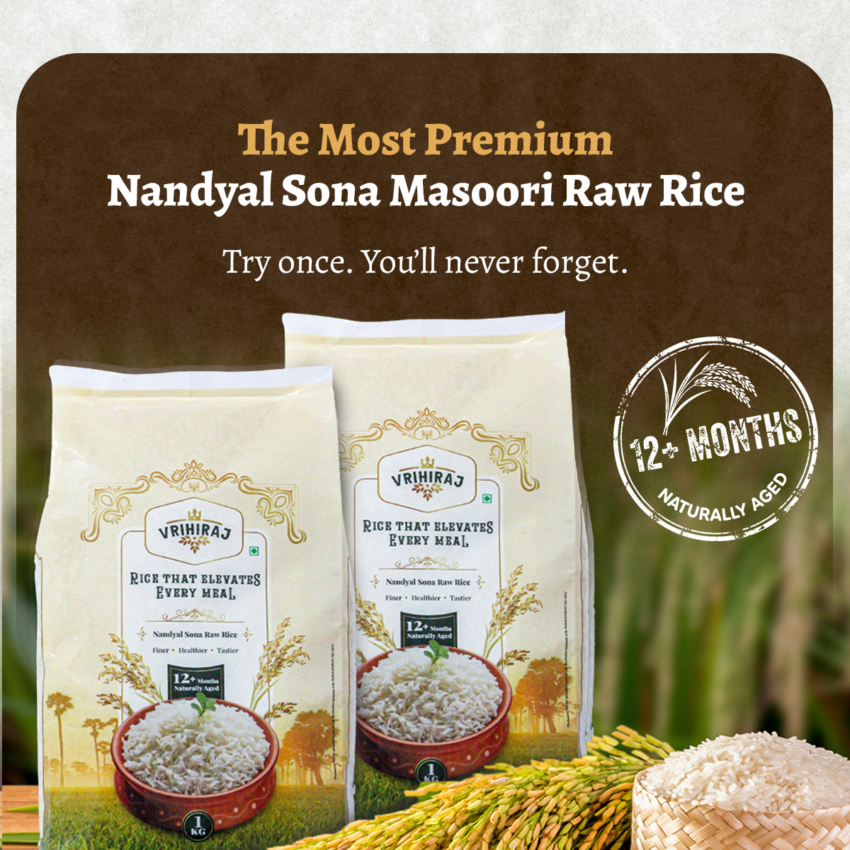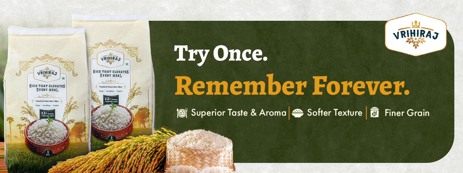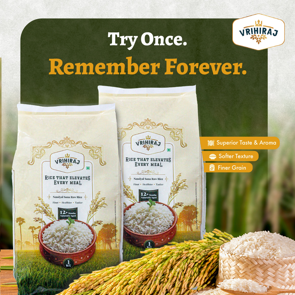 At Vrihiraj, we bring premium, authentic rice crafted through sustainable farming and scientific excellence. Our flagship Nandyal Sona (NDLR-7) offers finer grains, superior aroma, and exceptional taste, elevating every meal. We are committed to purity, quality, and delivering the best of Andhra Pradesh’s rich agricultural heritage to your home.