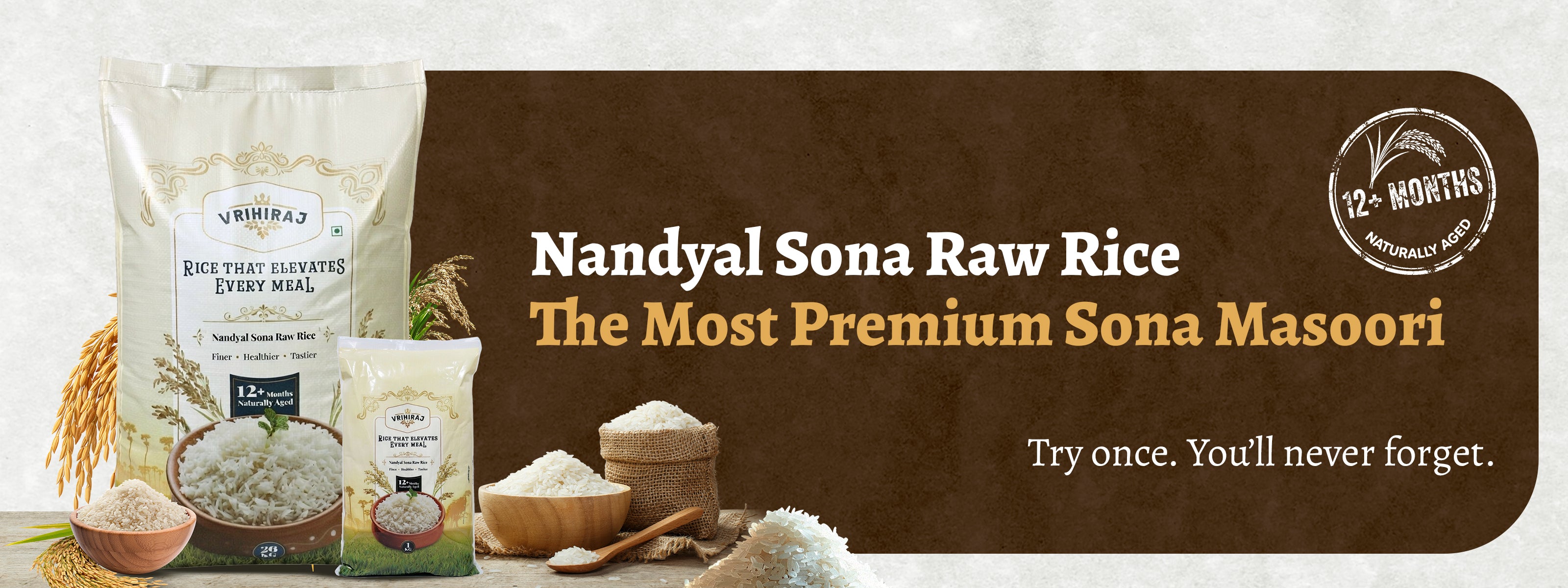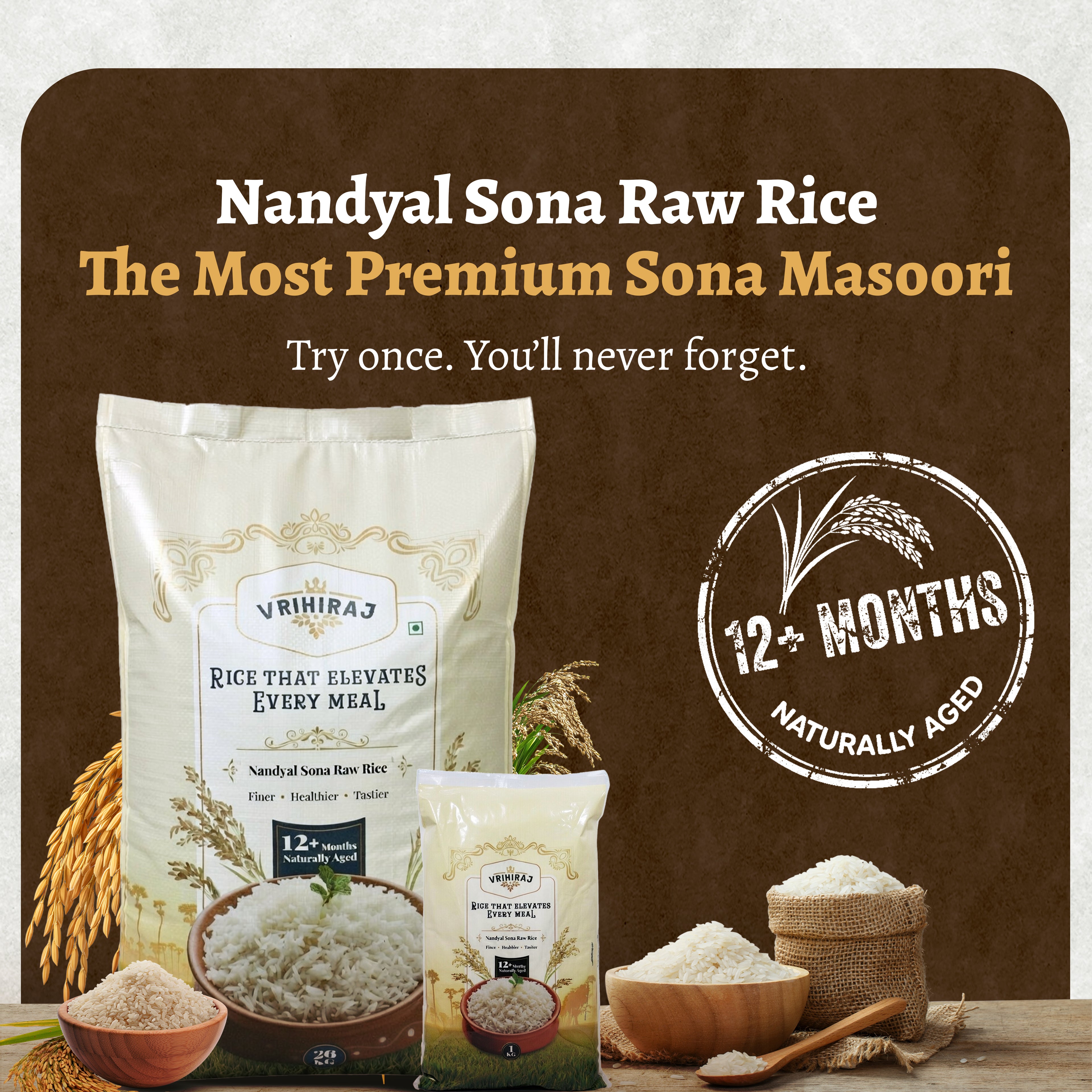 Experience the difference of naturally aged Nandyal Sona rice. From the moment it cooks, the aroma is fuller, the texture lighter, and every grain feels distinct on the plate. Carefully aged and traditionally milled, Vrihiraj rice delivers consistency you can see, smell, and taste